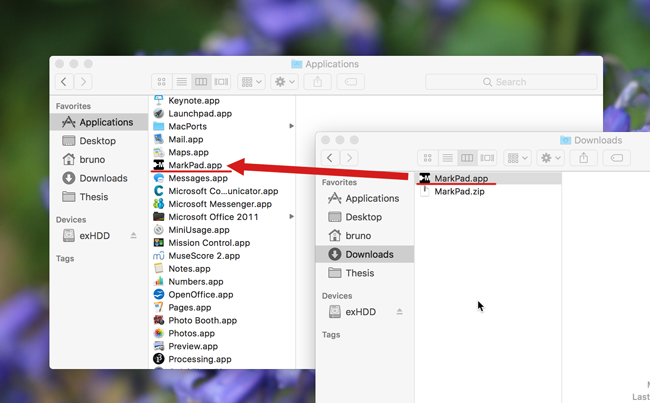Installing the application First, let's install the application (that you can get here). Just unzip the file and put the application in your Applications folder as shown on the picture.