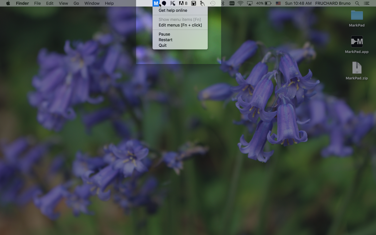 Launch MarkPad. An icon will then appear in the main menu bar of your Mac OSX system. At launch, your system may ask to provide specific permissions for the application. This is needed if you want to display the MarkPad menu by pressing the