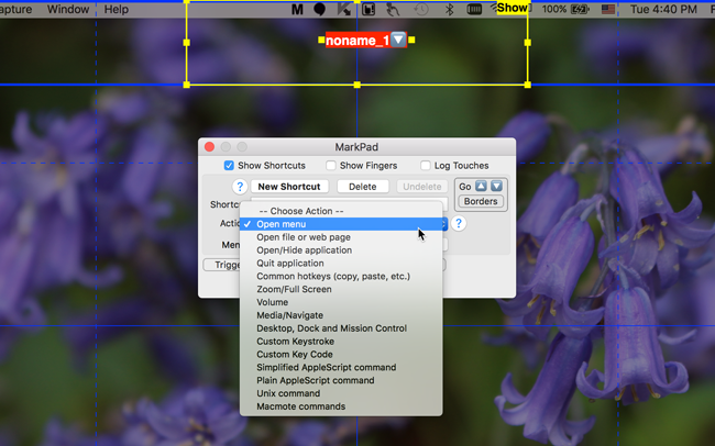 MarkPad is an application for Mac OSX that lets you trigger any action on your computer with a single stroke on your touchpad. It only requires one hand to trigger an action. MarkPad strokes start from the border of the touchpad, thus they don't conflict with pointing. Not convinced yet?