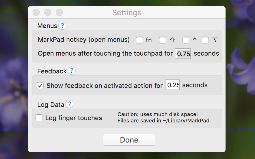 Changing the settings Click the cogwheel button on the top-right corner of the main window of the editor to open the settings window. From there you can change the keys used to show the MarkPad menu (max. 2). You can also hide/show feedback, change its delay and menus appearance delay. Finally you may want to enable touches log, to record interaction with your touchpad. Log files are saved in ~/Library/MarkPad/.